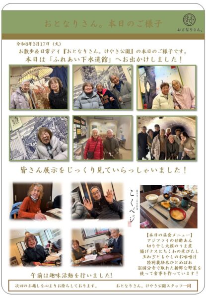 今日は昼頃から日差しが出始め、春の陽気になり、外出日和となりましたね。そんななか、おとなりさん。けやき公園では、小平市にある「小平ふれあい下水道館」に外出致しました。