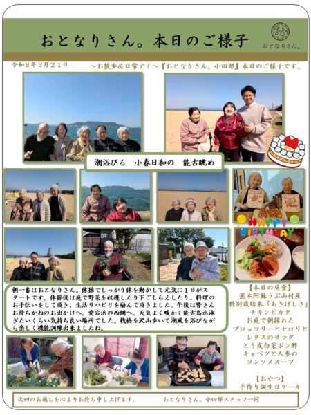 桟橋を沢山歩いて潮風を浴びながら楽しく機能訓練出来ました。事業所に戻ってからは3月生まれの方の誕生日会を開催。手作りケーキと歌でお祝いしました。