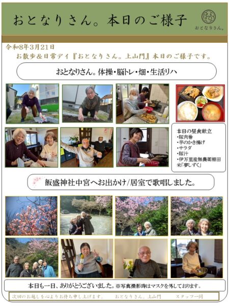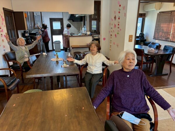 おとなりさん。上山門では今日も機能訓練に基づき一日の活動を行ってまいりました。