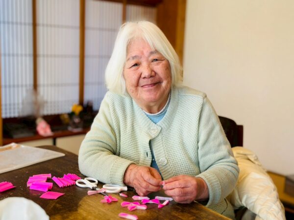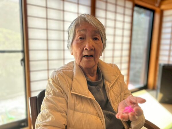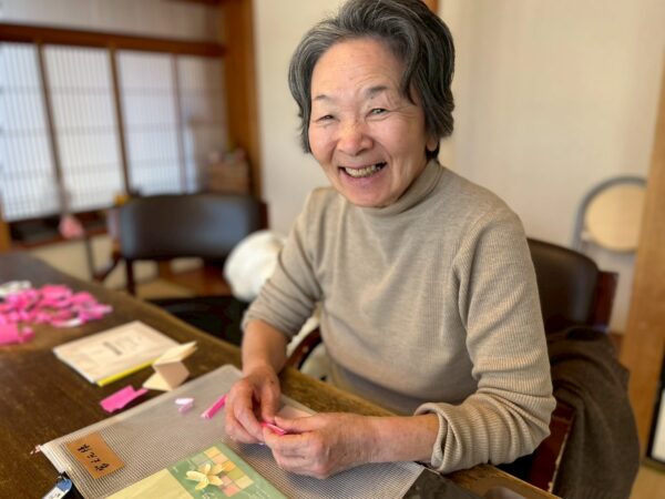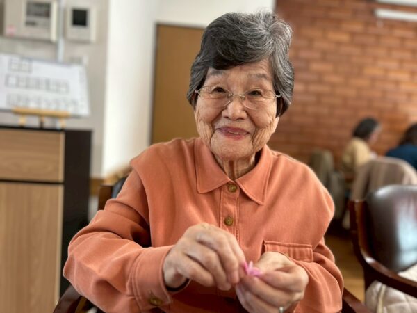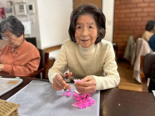 午前中の活動は、折り紙を使って桜作りをしました。