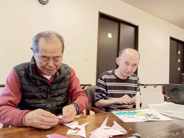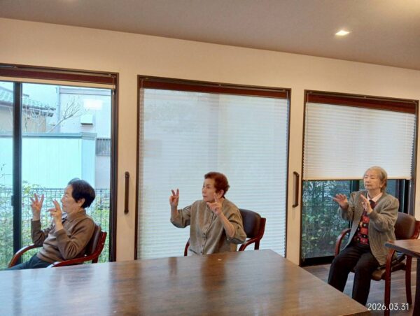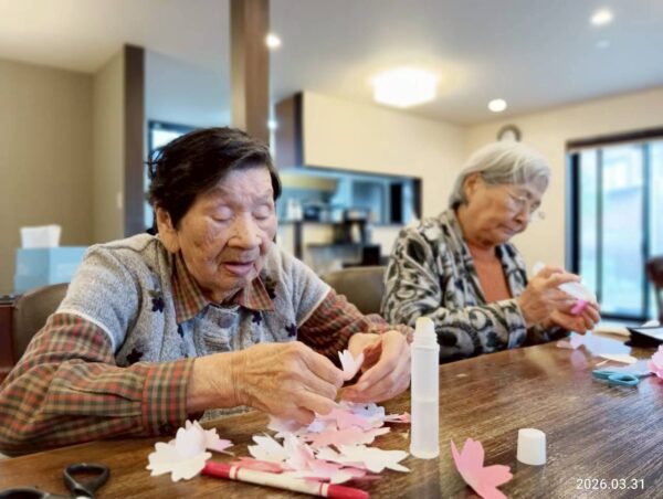 今日も朝一番はおとなりさん。体操でしっかり体を動かして元気に1日がスタートです。体操後は桜の花飾りを作りました。完成が楽しみですね。