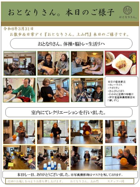 皆様こんにちは。本日は朝より風が強く雨も少し降っておりどんよりとした天気でしたね。そのような天候にも関わらずご来所いただきありがとうございます。まずは「おとなりさん。体操」を行い、午前中は脳トレを行いました。