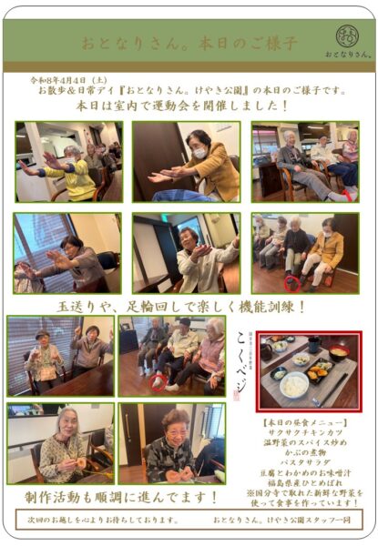 機能訓練体操もしっかりとおこない、お散歩に引けを取らないくらい身体を動かしましたね。