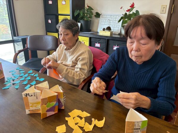 午前中は制作レクリエーションを行いました。「牛乳パックで作るペン立て」を作りました。
