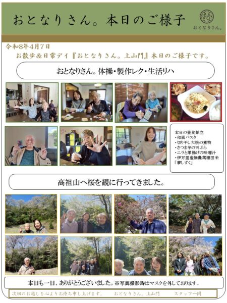 皆さん生活リハも精力的に行ってくれて大変助かっています。ありがとうございます。午後からは終盤を迎えている桜を観に高祖山へ行ってきました。