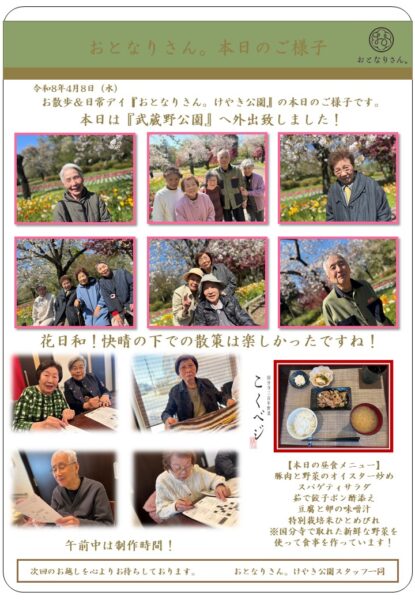 本日も快晴で半袖でも心地よいくらいの1日でしたね。おとなりさん。けやき公園では「武蔵野公園」に外出致しました!