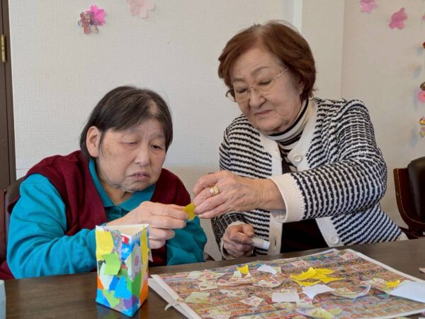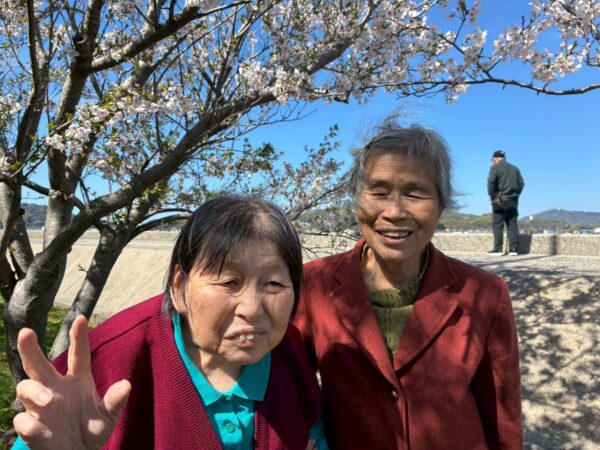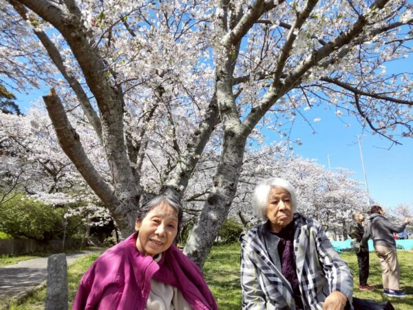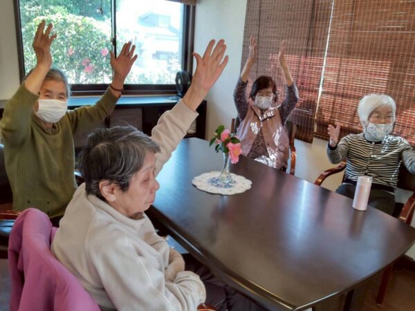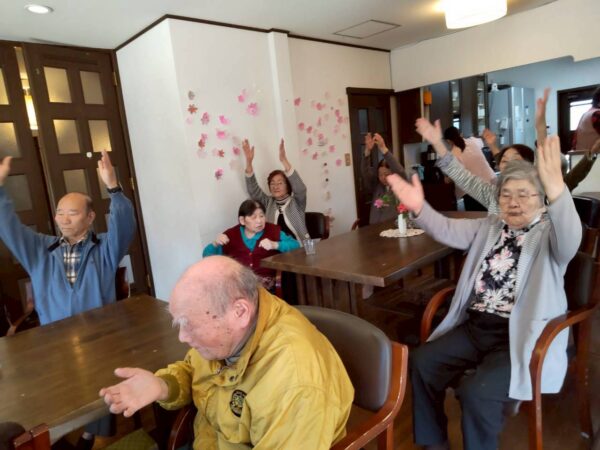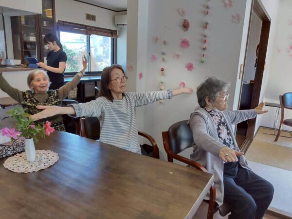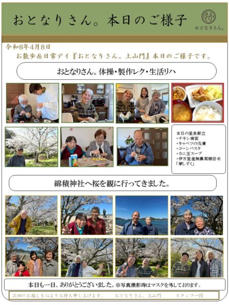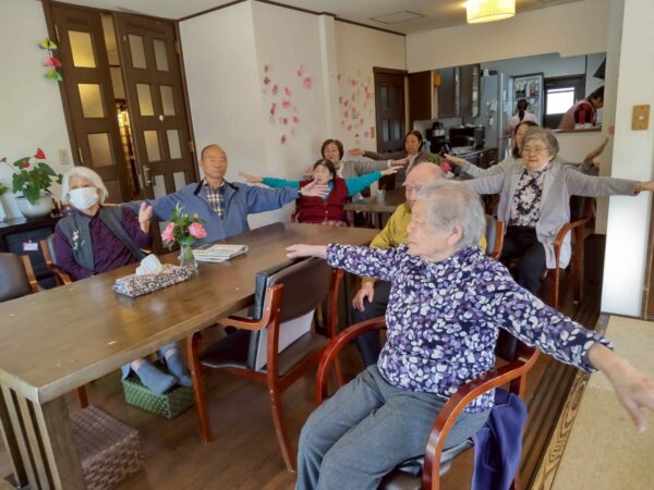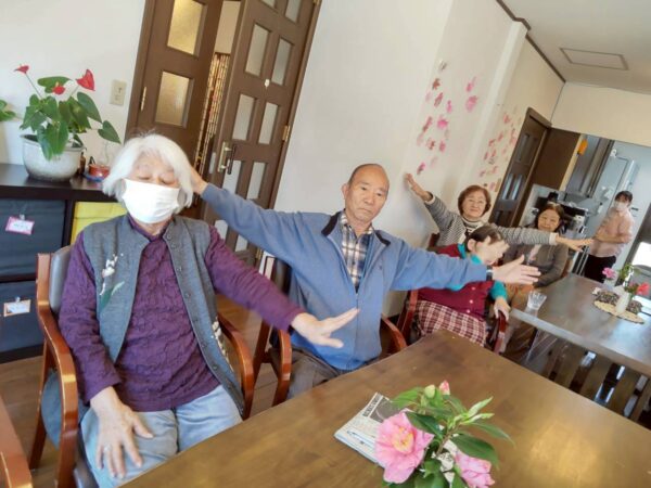 今日もおとなりさん。上山門は春の陽気の中、機能訓練を行いました。