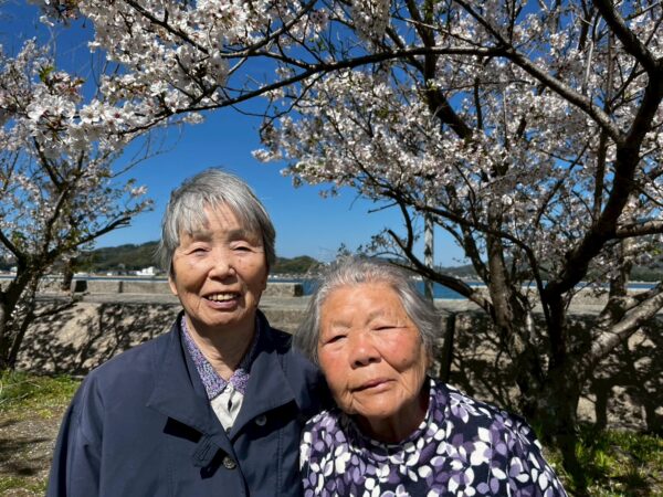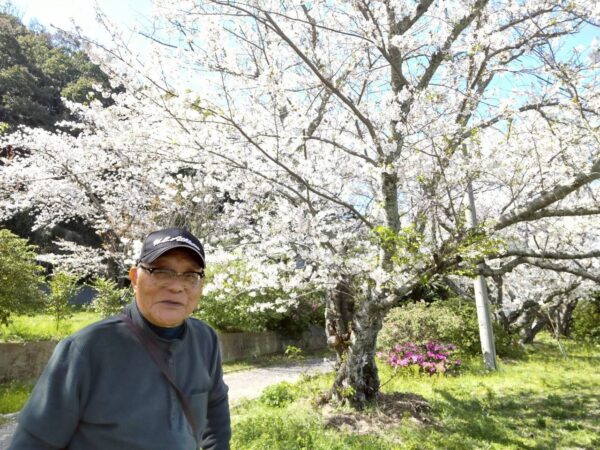 美しい浜辺を背景に満開の桜が綺麗に咲いていました。