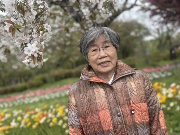 遅咲きの桜も咲いており、花壇には満開のチューリップとポピーが咲いており、