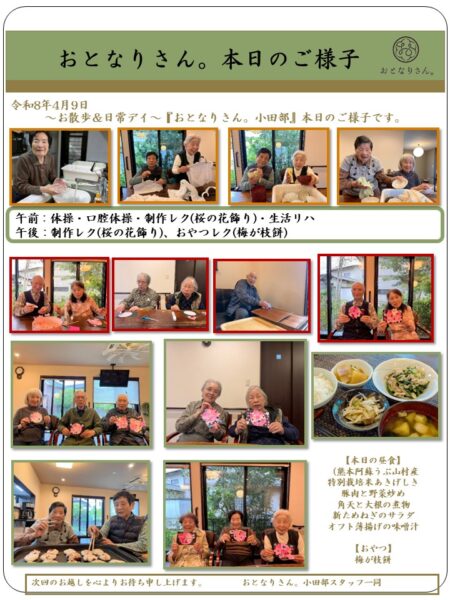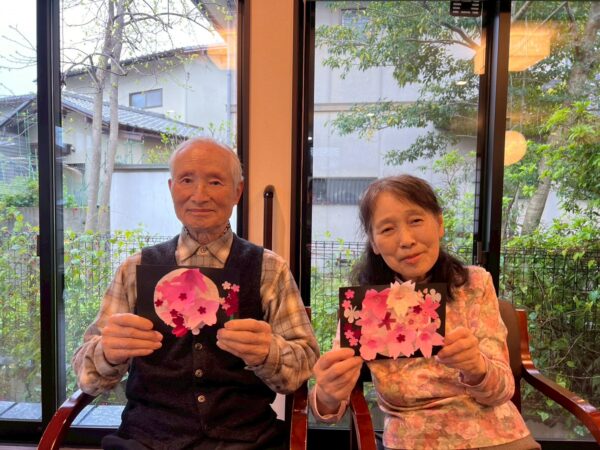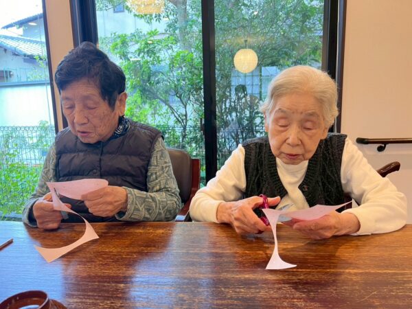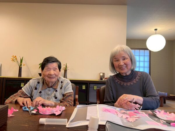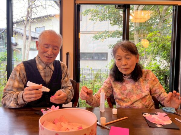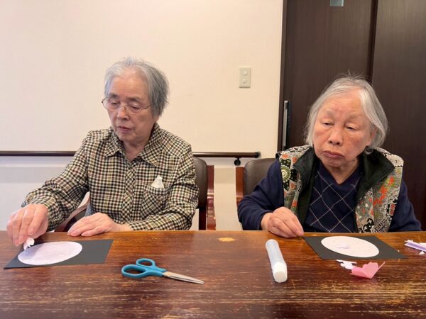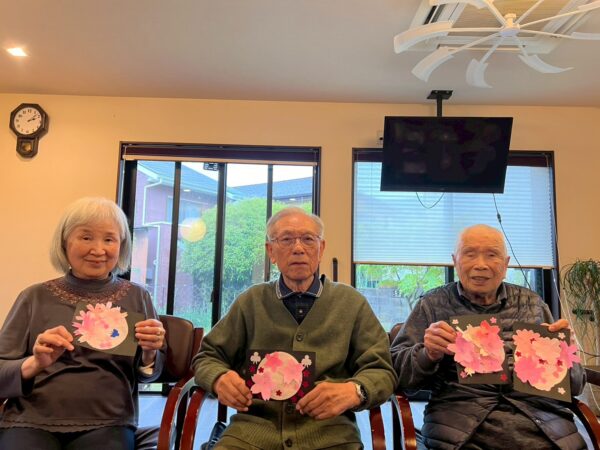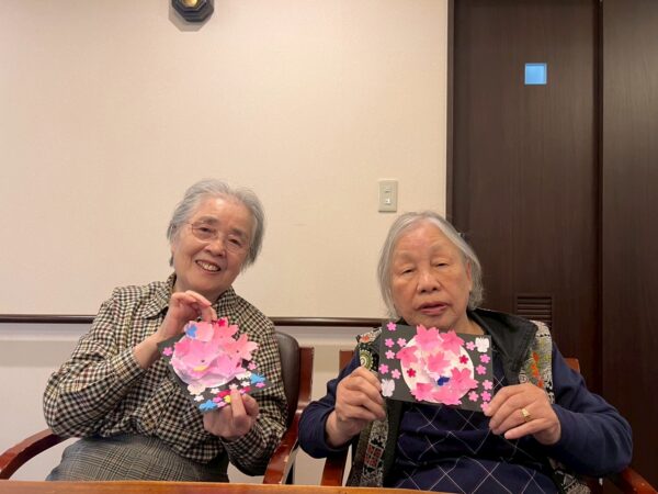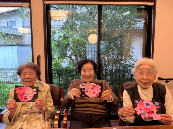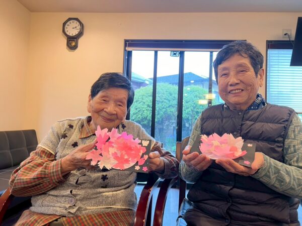 本日は雨天の為、室内で午前中の続きの制作レクで桜の花飾りを完成させました!