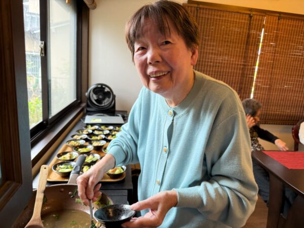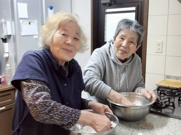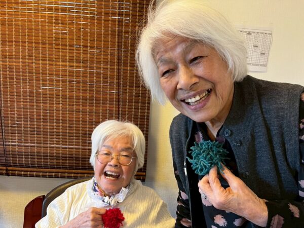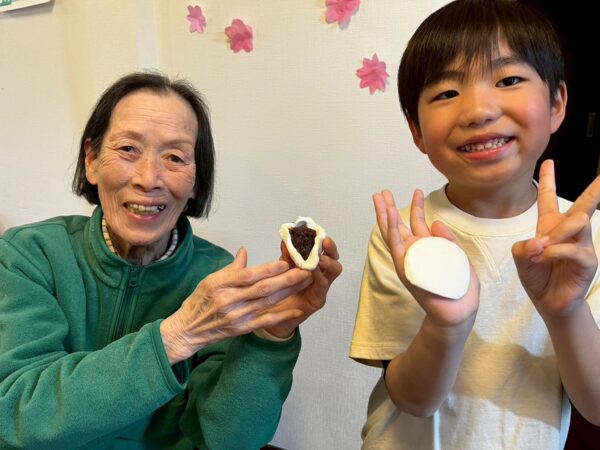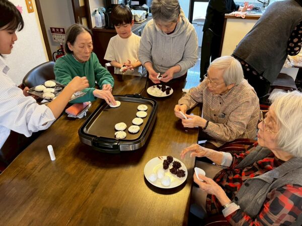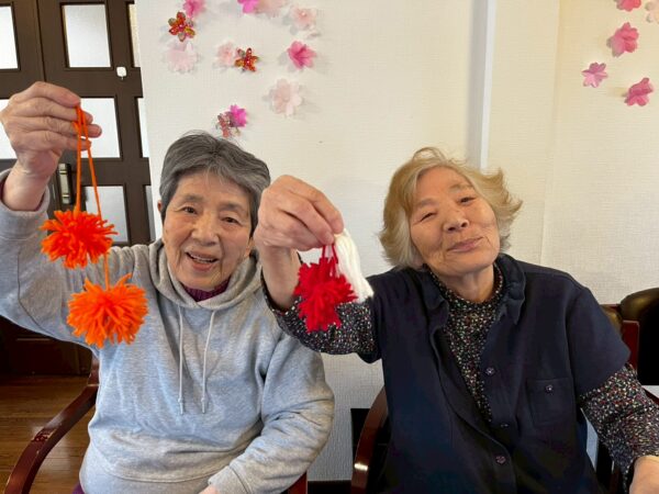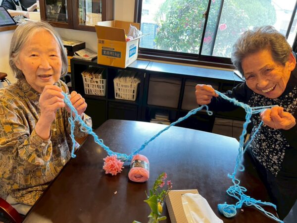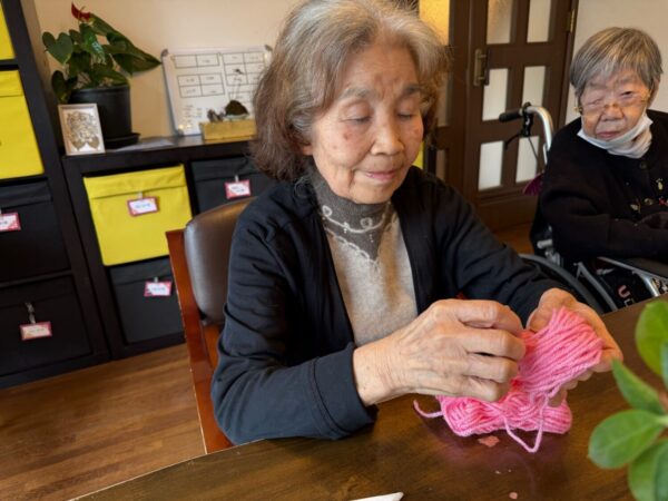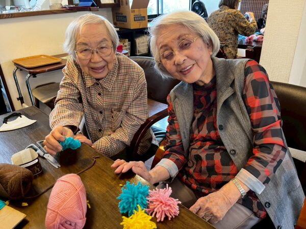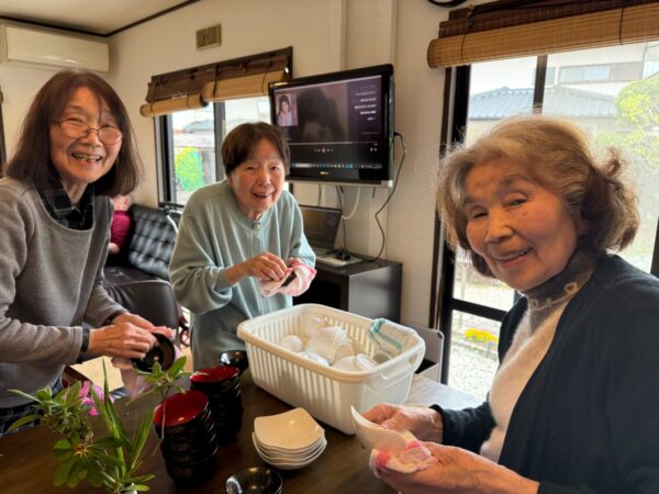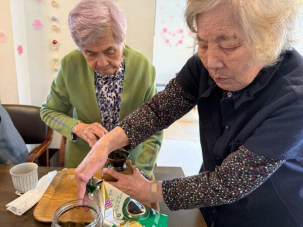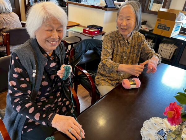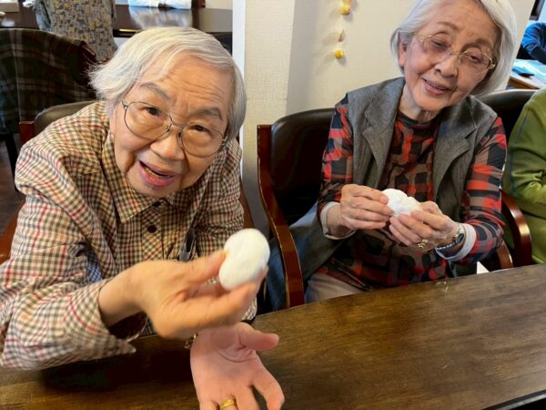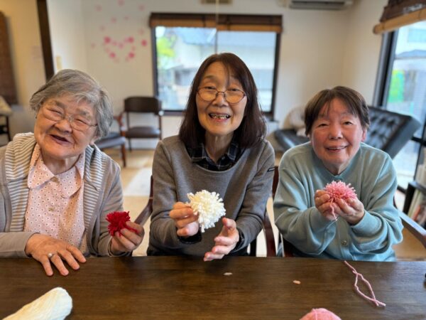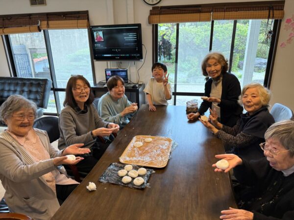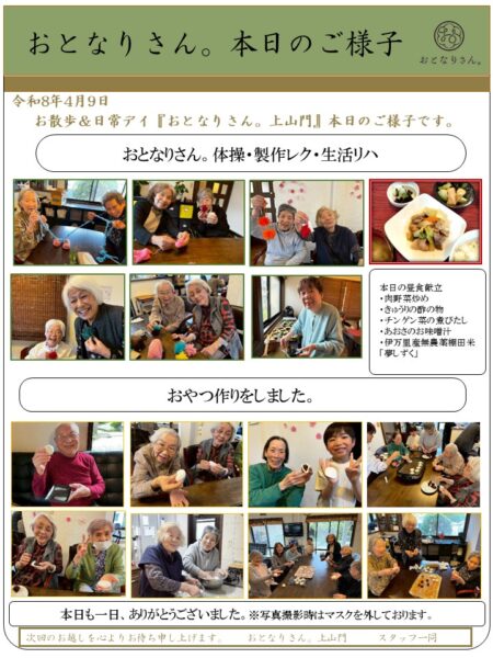 おとなりさん。では午前中は体操や制作、生活リハビリで身体を動かしていただき午後からはおやつ作りをして過ごしました。
