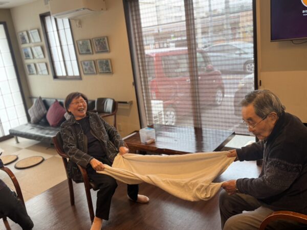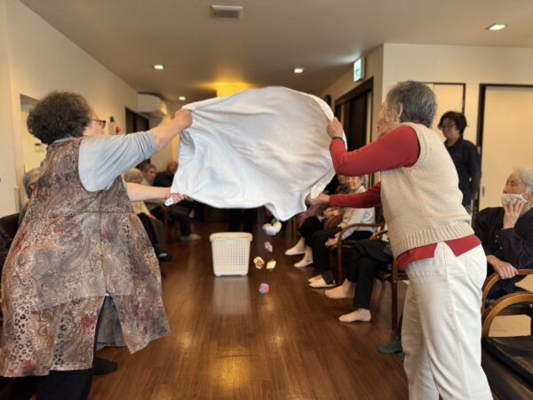午後は雨が降ってきましたので、室内で運動会を実施しました。玉入れや足輪送り、ピンポン玉渡しまで、2つのチームに分かれ、大盛り上がりの運動会となりました。