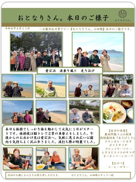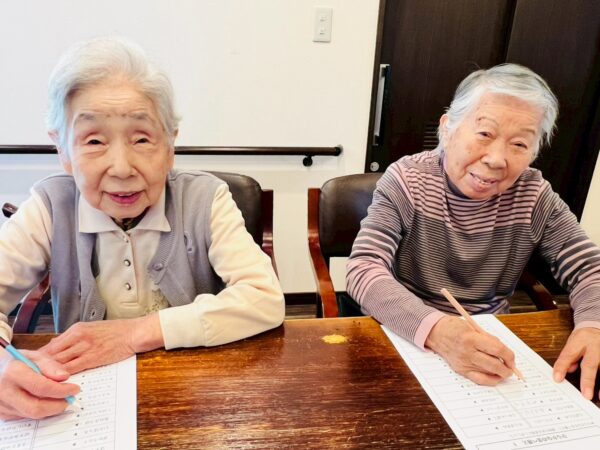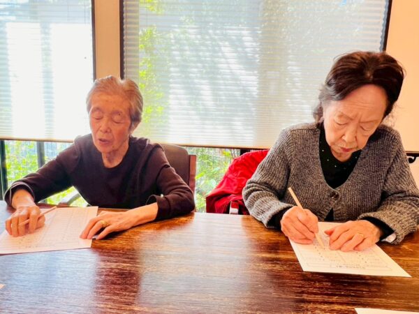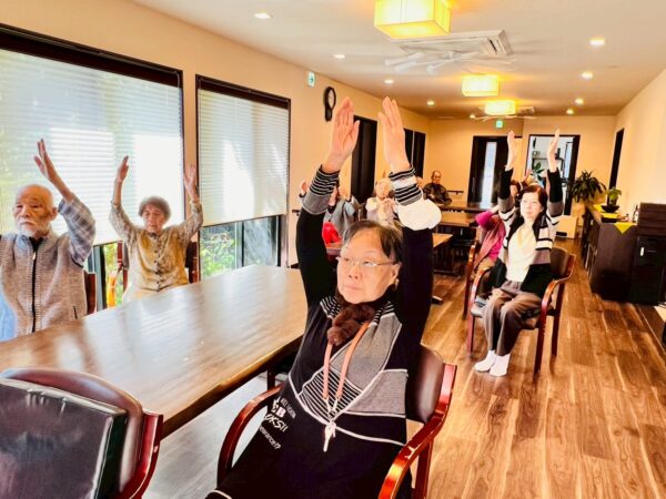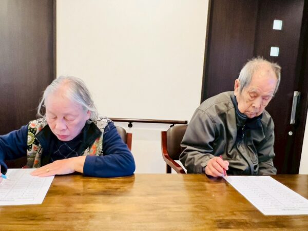 本日もおとなりさん。体操でしっかり体を動かして元気に1日がスタートです。体操の後は脳トレで言葉の並べ替えをしました。頭の体操もばっちりです。