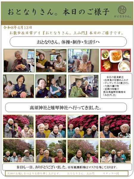 今日も一日雨模様でしたが、おとなりさん。上山門ではお出掛けや作りものの作業や生活リハビリを通して機能訓練を行いました。