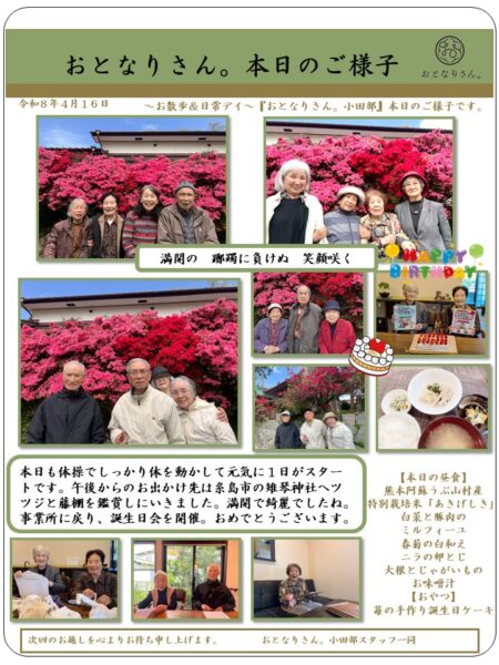 見事なツツジを目に焼き付けて事業所に戻った後は、誕生日会を開催。本日誕生日を迎えた方を含め2名様のお祝いをしました。手作りの苺のケーキを美味しく頂きました。おめでとうございます。
