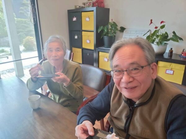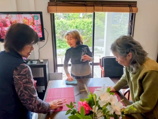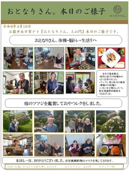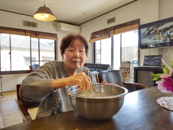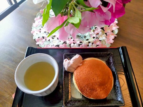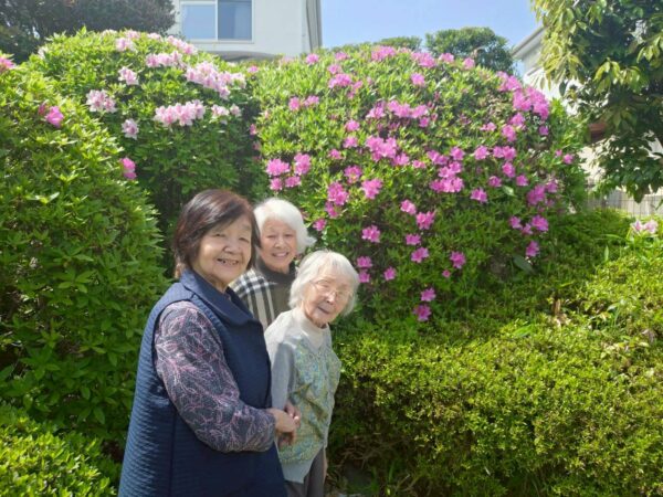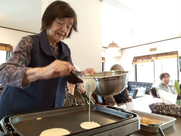 皆さんで協力して配膳や片付けもあっという間に終了です。いつもありがとうございます。午後からは上山門の庭に咲き始めたツツジの花を観ながら散策した後、皆でおやつにホイップ餡のどら焼きを作りました。
