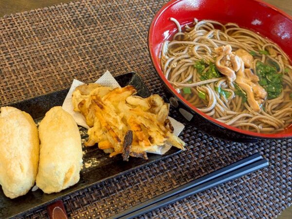 口腔体操をした後はお昼ご飯です。今日はお蕎麦とかき揚げ、いなり寿司です。皆さんに大好評でした。