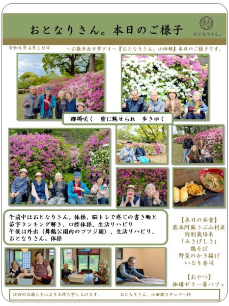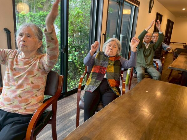 まずはおとなりさん。体操でしっかりと体を動かし、その後はホワイトボードを使った脳トレです。今回は漢字の書き順と全国と福岡の苗字ランキングをともらいました。