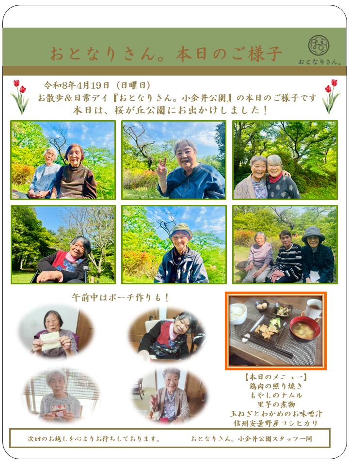 おとなりさん。小金井公園では多摩市にある桜が丘公園にお出かけしました。