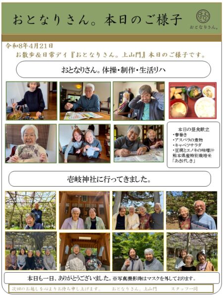 このお出掛け日和をしっかり機能訓練に結び付け、今日も活動して参ります。