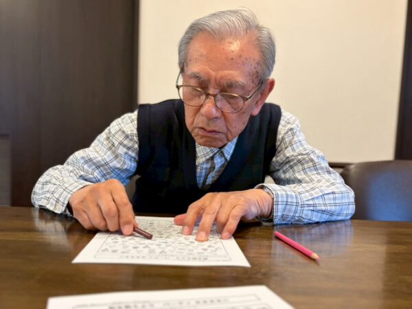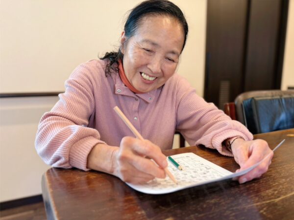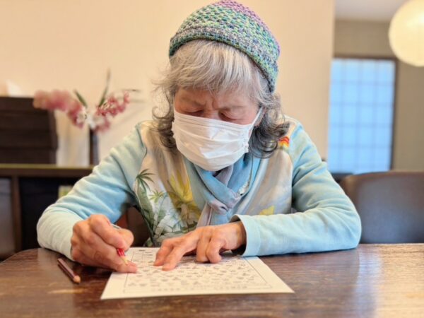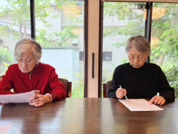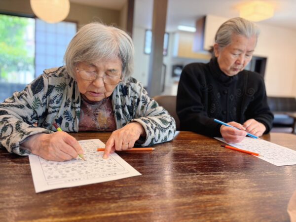 午前中の活動は脳トレ行いました。テーブルのご利用者様同士考えて答えを見つけられていました。