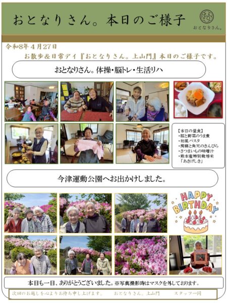 皆様こんにちは。今日は朝から晴天に恵まれた一日でした。おとなりさん。