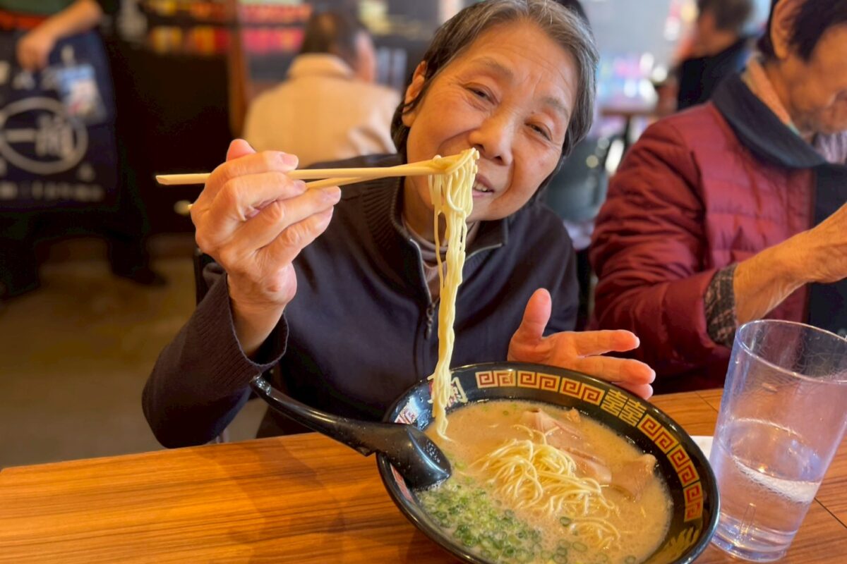 麺をあげ ズズッとすする 一蘭の森